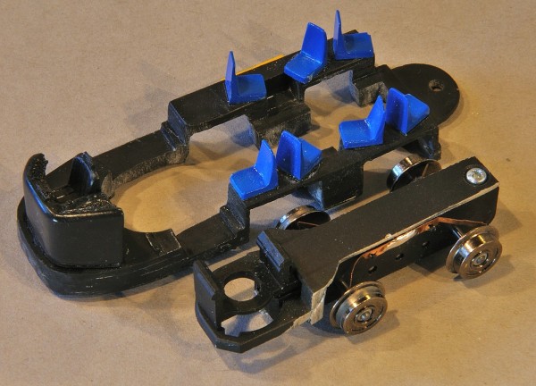 BILD 6: Blick auf die Unterseite des fertiggestellten Antriebsfahrwerks. Gewichtsverteilung und OptikZum Gewichtsausgleich mit dem Antrieb wurden im Gelenkbereich des Wagenteiles I diverse Metallgewichte angebracht; in den Dachbereichen der nichtschwebenden Wagenteile III und V wurden ebenfalls Metallgewichte eingebaut.